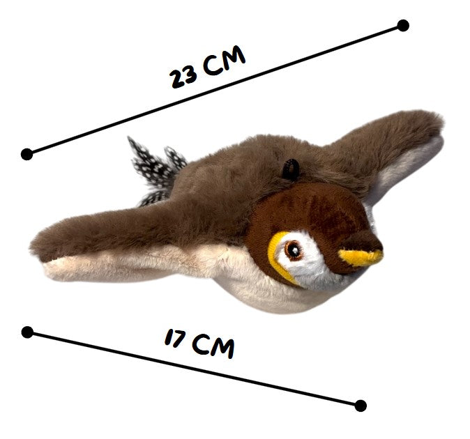 The bird measures 23 x 17 x 8 centimeters, perfect for cats to play with and chase. Small enough to move easily, but large enough for lots of fun!